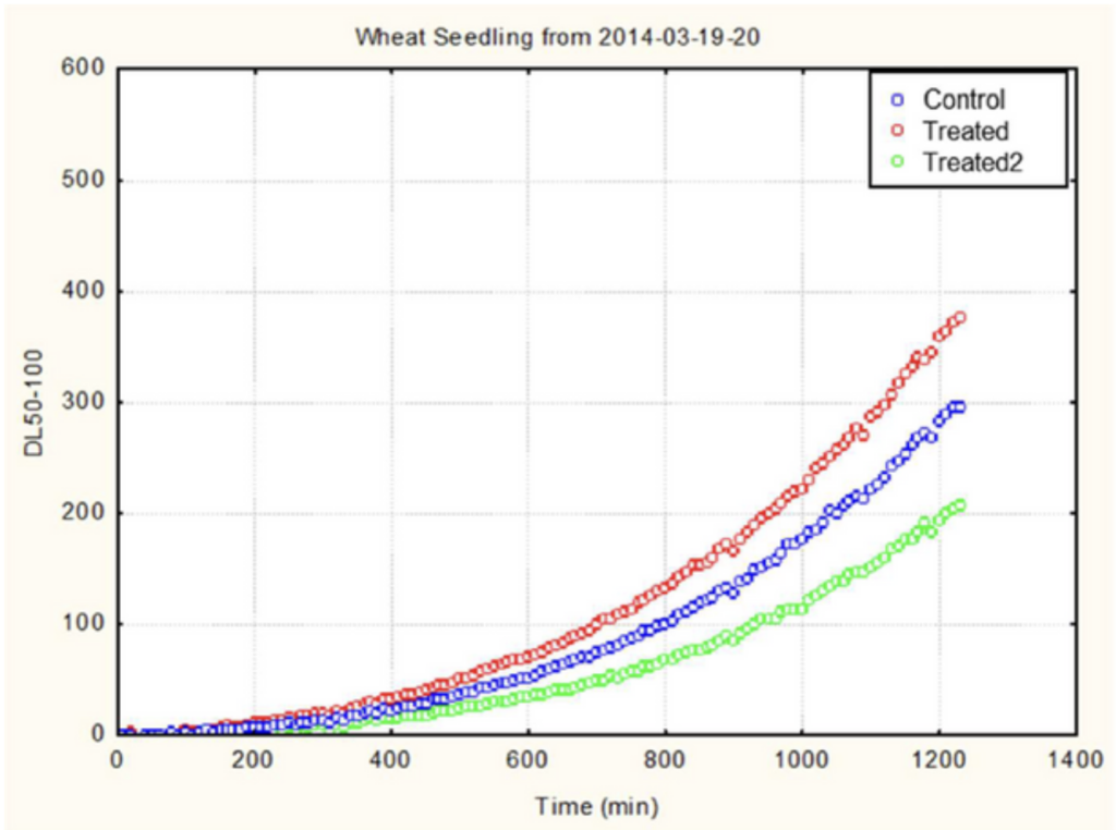 Figuur 4. DL50-100-waarden van tarwezaailingen die zijn ontkiemd met onbehandeld leidingwater (Controle, blauwe cirkels), Coherent stabiel water (Behandeld, rode cirkels) of Test Water 2 (Behandeld2, groene cirkels). Zaden die met Stabiel Coherent water waren behandeld, leverden de hoogste DL50-100-waarden op. Deze grafiek toont de resultaten van één representatief experiment. Een vergelijkbare trend werd waargenomen in 7 van de 9 experimenten die in de loop van het onderzoek werden uitgevoerd.
